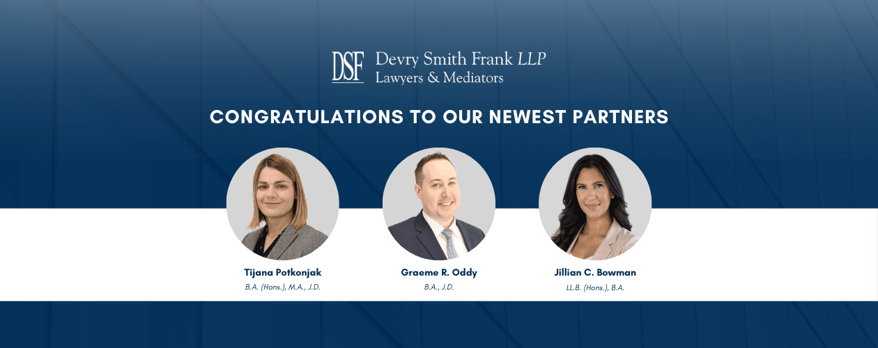 Home to over 160 dedicated lawyers and support staff with locations in Toronto, Barrie, Whitby and more. Devry Smith Frank LLP (‘DSF’) is proud of its 60-year history of providing excellent client services. Our lawyers have the experience and know-how to navigate a variety of legal issues for our diverse range of clients. DSF excels in handling complex issues across a wide range of legal fields in our offices across the GTA. Among our many areas of practice, we can litigate, complete your corporate transaction or help mediate a dispute. We can help you sell or buy your real estate, prepare your will or immigrate to Canada. Our team includes lawyers around the GTA and other legal professionals with the experience and commitment necessary to handle all manner of matters for corporations, individuals and small businesses with ease and professionalism.
